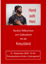 Unter dem Thema "Hand aufs Herz" gestaltet die "Kreuzbänd" am kommenden Sonntag um 10:00 Uhr den Gottesdienst. Die geistlichen Impulse wird Pfarrer Knut Trautwein setzen.